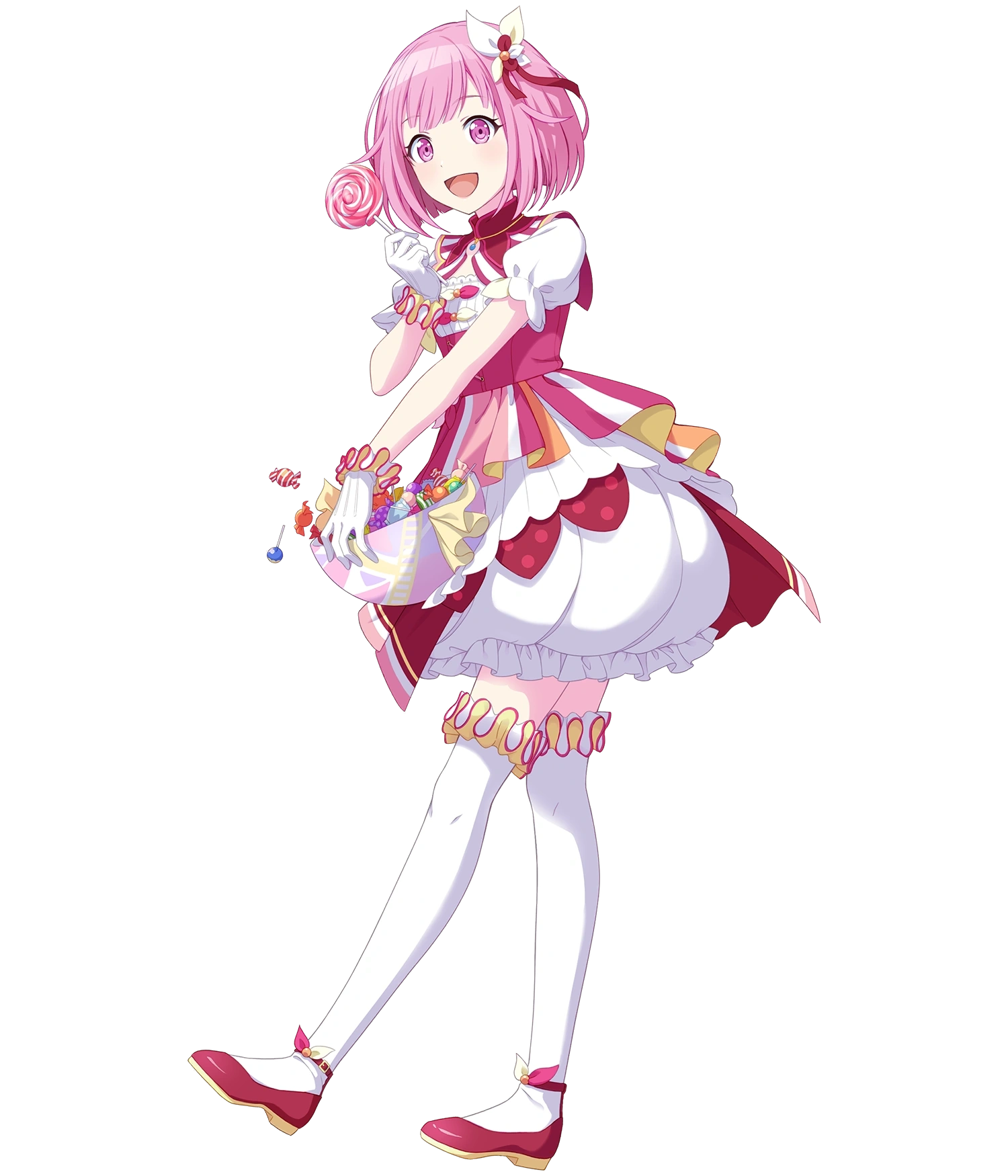 Su traje de espectáculo consiste en un vestido redondo y esponjoso con lazos brillantes de varios tamaños atados en el borde inferior. Lleva un lazo similar en el cabello, en la parte frontal del atuendo y en sus zapatos. Sus brazos tienen pequeñas mangas abultadas desmontables que parecen gotas de caramelo decorativas, un guante blanco de ópera en su brazo izquierdo y una pulsera en su muñeca derecha. Sus medias hasta los muslos son desparejas: su pierna izquierda tiene un patrón de bastón de caramelo rosa y blanco, mientras que la derecha es completamente blanca. En la parte inferior de su pierna izquierda, donde su zapato de tacón se encuentra con su tobillo, lleva una pequeña «x» de color cian brillante. La parte superior de su vestido contiene pequeñas piezas de encaje que se extienden sobre la falda de su expresivo vestido rosa. En la imagen oficial de su atuendo de unidad, sostiene un cuenco blanco con un diseño amarillo, rosa y morado, y volantes amarillos en los lados; el festivo cuenco contiene caramelos envueltos de colores.