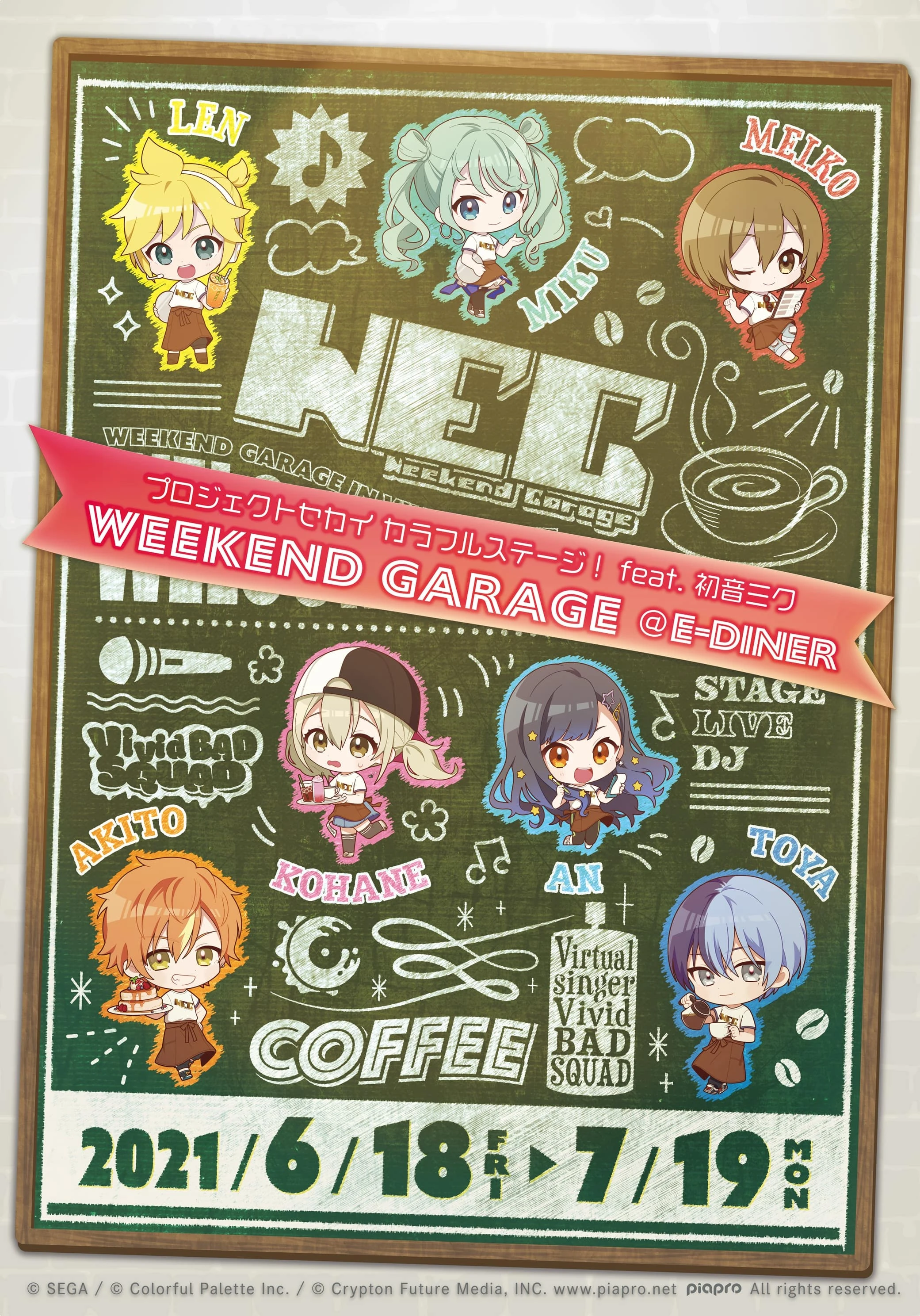 WEEKEND GARAGE @E-DINER fue una cafetería y tienda pop-up organizada por Edith Co., Ltd. E-DINER organiza cafés de colaboración con muchas series de anime y de estilo anime, como Holostars y Yu Yu Hakusho. La cafetería abrió el 18 de junio de 2021 y cerró el 19 de julio de 2021 en Sunshine City Alpa.