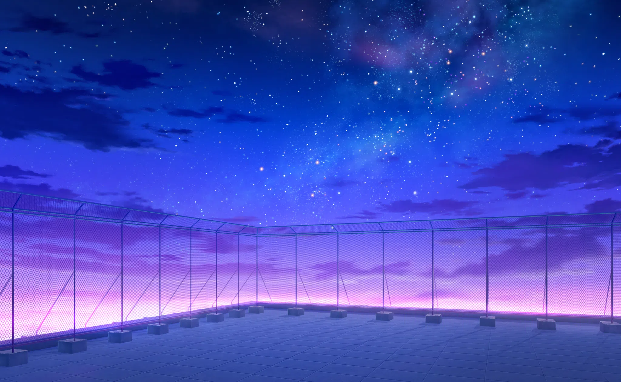 The School SEKAI has a school campus theme, specifically set sometime after class ends. It always stays at a certain time of day, near golden-hour sunset, until the members' emotions change the time.[1] There is one main classroom that all characters enter when they access the SEKAI; however, it is known that there are other classrooms within the SEKAI, as well as an accessible rooftop. Fluffy clouds can be seen passing by the classroom windows, while the rooftop showcases a beautiful, dark starry sky. The roof has gates surrounding the perimeter, the top being curved. In the hallways, there are desks stacked near the classroom doors and the school windows. There are also speakers and cables scattered all over the ground.
