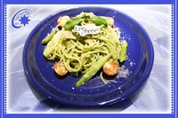 Leo/need's The Sky I Saw On That Day Pasta | Pasta with Genovese sauce, garlic, bacon, asparagus, cherry tomatoes, Grana Padano cheese, basil and a monaka |