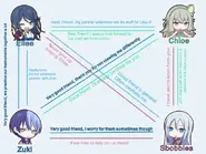 Then, Ellee met the passionate bassist Chloe. As they bonded through their love for metal, they became best friends and played their first gigs as a duo. They later meet soft-spoken keyboardist Sbobbles, who is Chloe's childhood friend and the stoic but kind drummer Zuki. As they began to know each other more, they formed a group together. Ellee named the group "WanderWALL" as they aim to surpass the walls of sorrow with music.